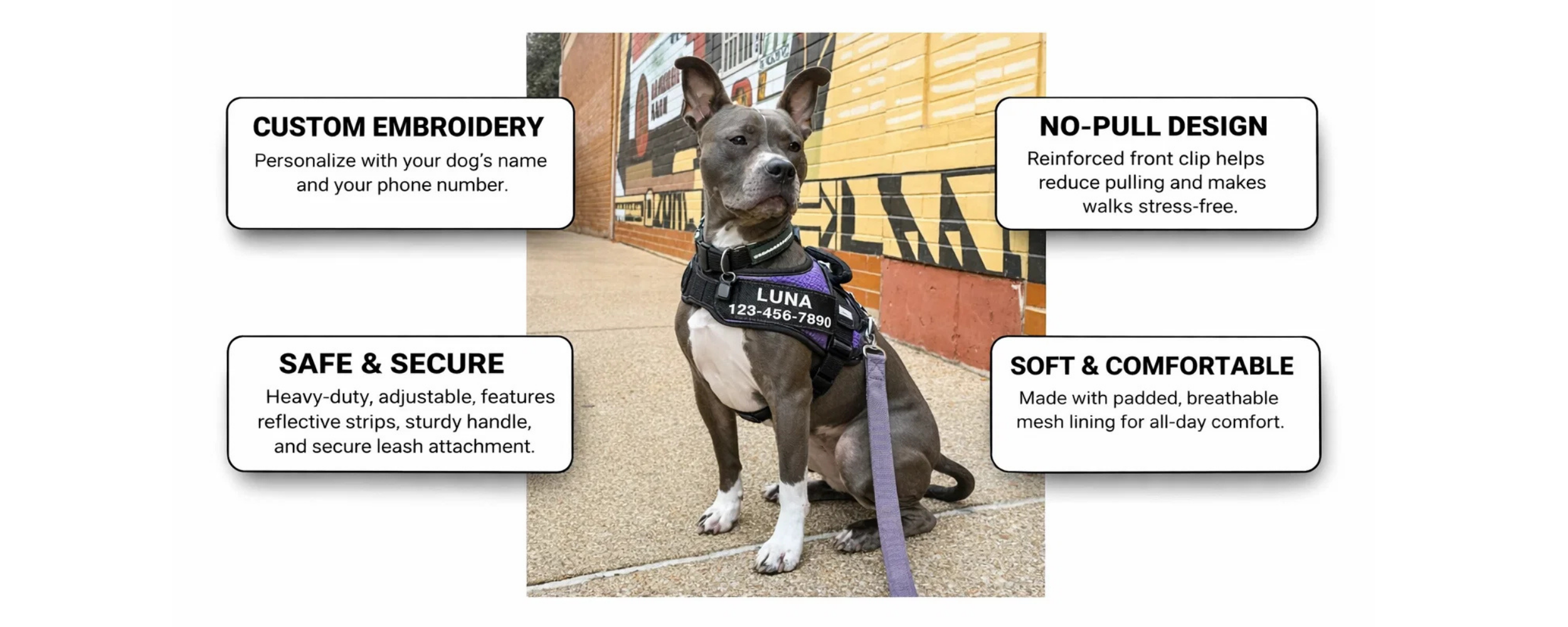 Focusing on Comfort and Control The harness features custom identification on both sides and breathable, durable fabric suitable for daily walks, runs, and training. The no pull design is intended to reduce concentrated pressure on the dog's neck and throat area.